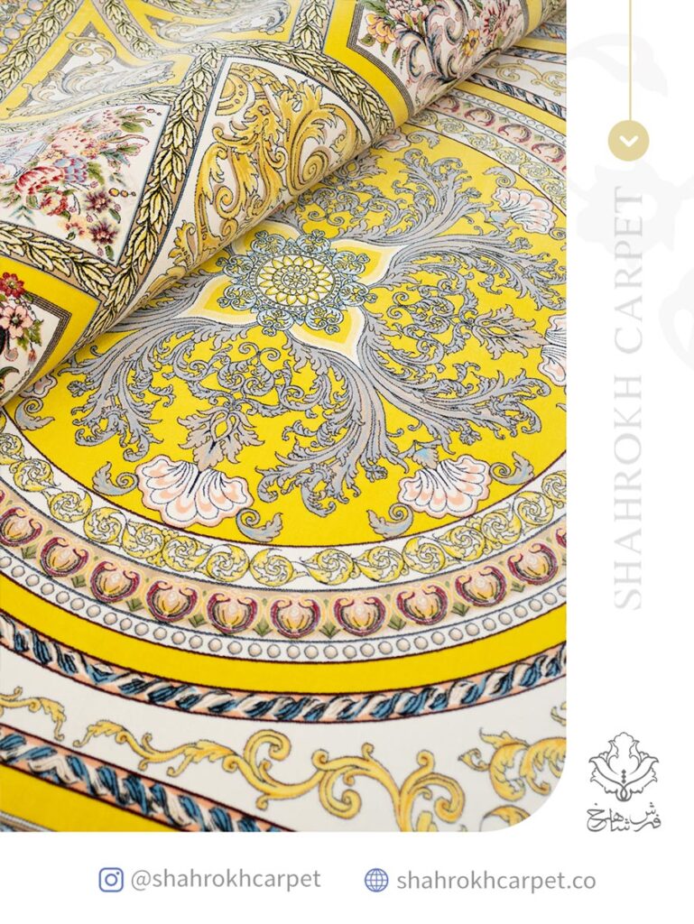 The 1700-reed rugs of Shahrokh Company are made of modal pile yarns. They look like handmade silk rugs. This similarity has two main reasons. First, they have about 5.7 million points of thread per square meter, which means the density of knots are so high that almost every delicate detail can be woven. Secondly, their finishing is done by hand. In other words, the shearing, washing and fringe and overlock stitching are all done by hand. These machine-made silk rugs are so similar to handmade silk rugs that they are sometimes called semi handmade silk rugs.